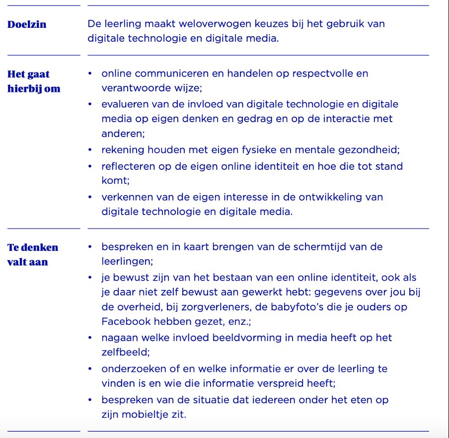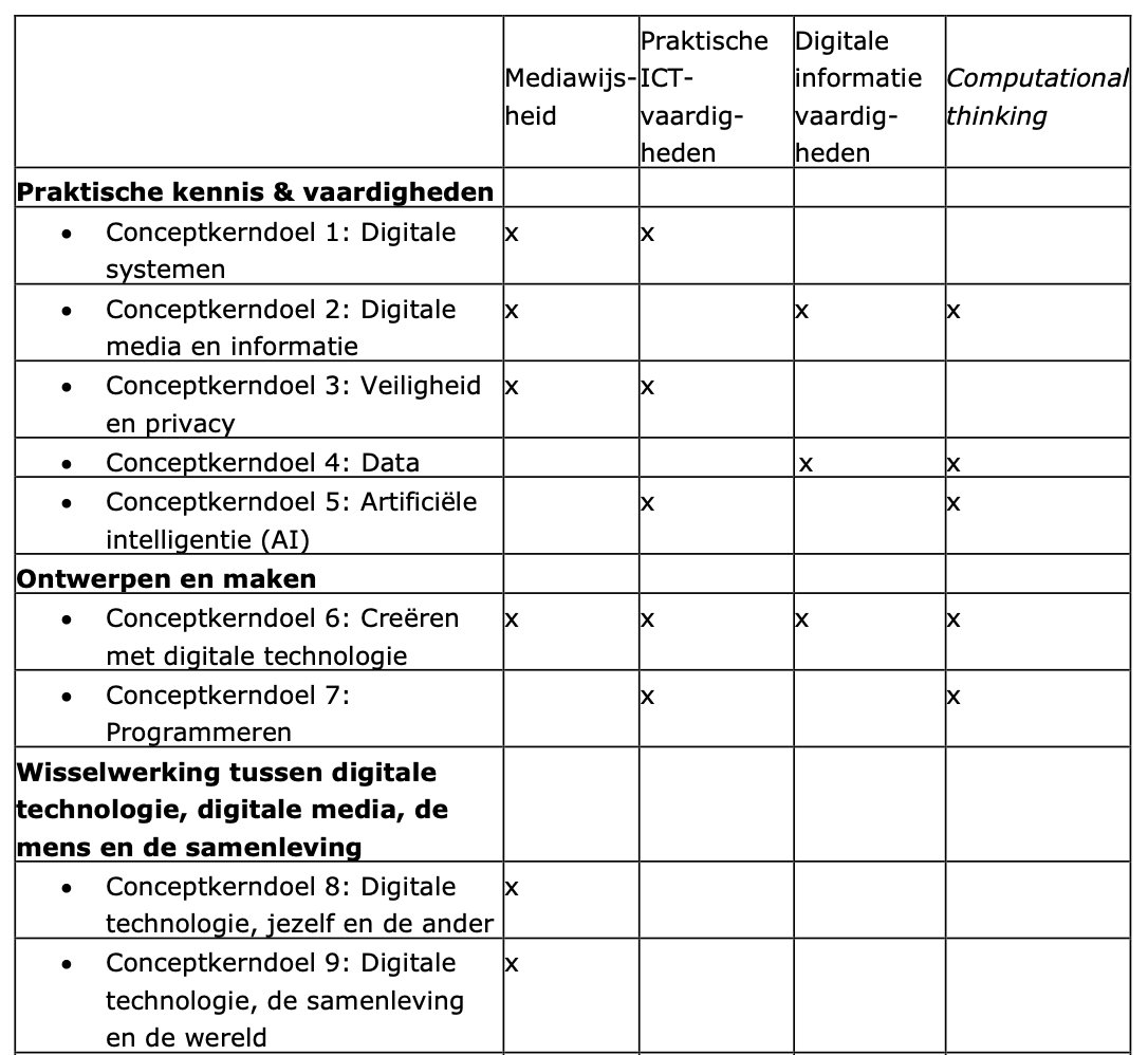 • Curriculum.nu. (2019). Leergebied Digitale Geletterdheid. Voorstel voor de basis van de herziening van de kerndoelen en eindtermen van de leraren en schoolleiders uit het ontwikkelteam Digitale Geletterdheid. Curriculum.nu.