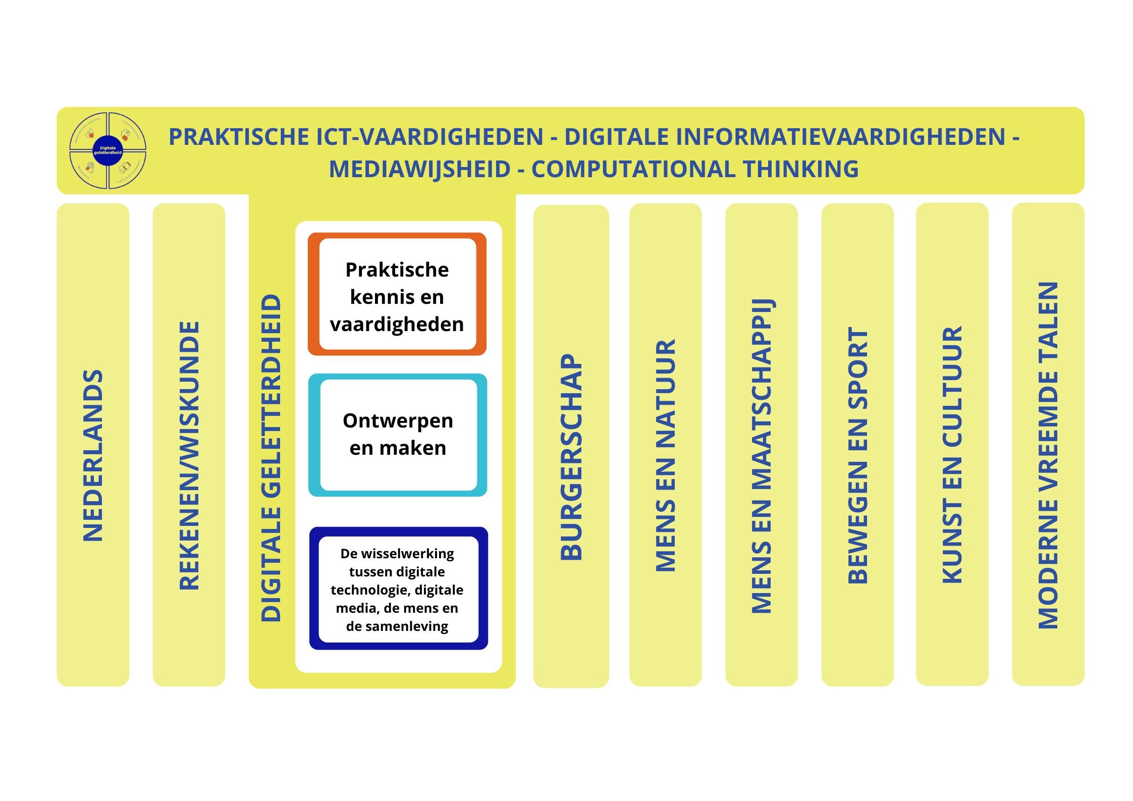 Figuur 4 laat zien hoe de samenhang tussen de conceptkerndoelen digitale geletterdheid – via het vierdomeinenmodel – met de andere acht leergebieden in een school georganiseerd kan worden. Hierbij komen aspecten van digitale geletterdheid ook in samenhang met de andere leergebieden aan bod.
