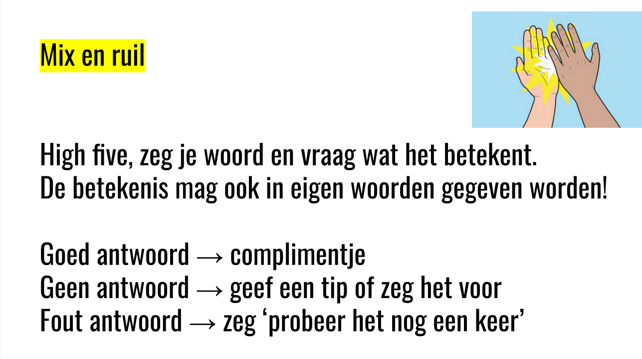 Mix en ruil is een interactieve werkvorm waarbij de leerlingen allemaal in beweging zijn. De opzet is heel simpel. Je geeft alle leerlingen een briefje met daarop een vraag, som, afbeelding of opdracht. In één hand het kaartje en de andere hand in de lucht. De hand in de lucht geeft aan dat je beschikbaar bent. De leerlingen lopen allemaal rond door de klas en zodra ze iemand tegenkomen die ook een hand in de lucht heeft, geven ze elkaar een high five. De leerlingen stellen om de beurt hun vraag aan de ander, beantwoorden elkaars vraag en ruilen daarna van kaartje. Hand in de lucht en op zoek naar de volgende partner!